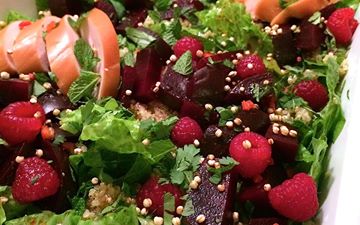 5. quinoa salade met rode biet, gerookte kip en frambozen